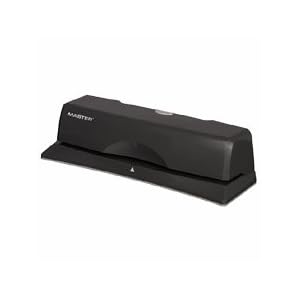 Electric Three-hole Desktop Punch drills through 10 sheets of 20 lb. paper at a time consistently without jamming. Punch creates 9/32" holes for easy page turning. Button on top makes it easy to activate. Simply push and punch effortlessly. Adjustable paper guide is built into the base. Large chip holder in base gives you plenty of disposal space. Punch includes AC adapter or use with six AA batteries (sold separately). Battery use provides enough power to operate it for a year of average use.