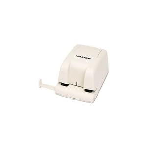 MATEP210 Electric Two-Hole Punch, 10-Sheet Capacity Punches in a standard two-hole pattern (2 3/4" centers) quickly and quietly. Optional battery power for portable convenience. Includes reverse motor mechanism to clear jams. Adjustable paper guide for accurate punching. Automatic on/off. Large capaci
